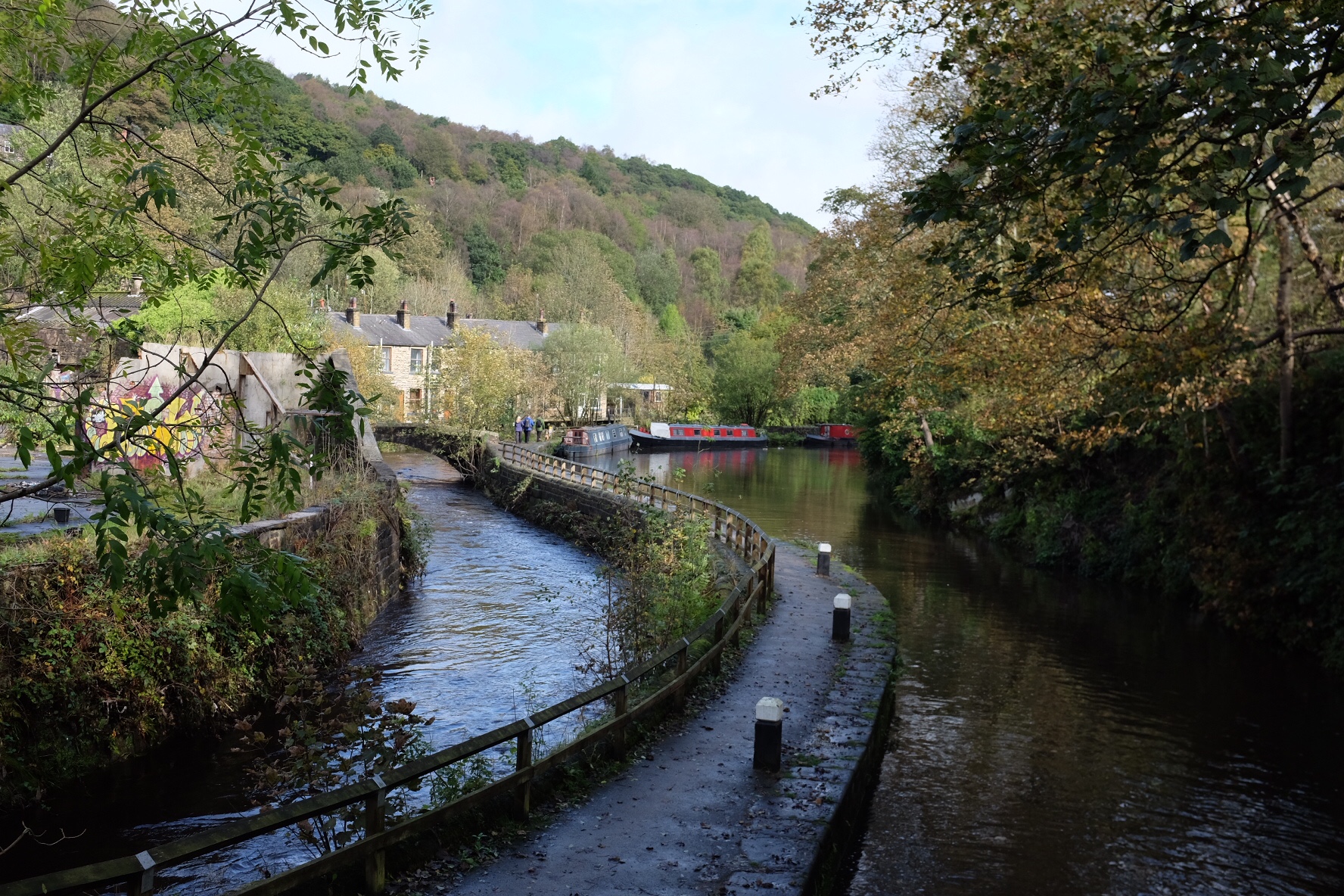 The full river running alongside the canal, with clearer skies.