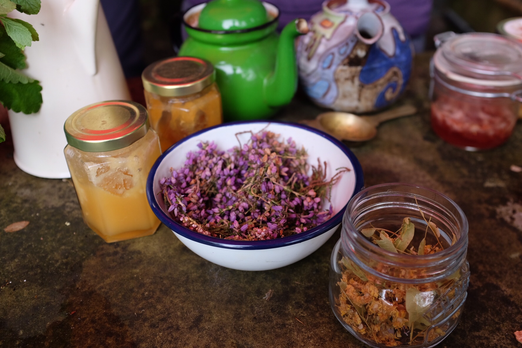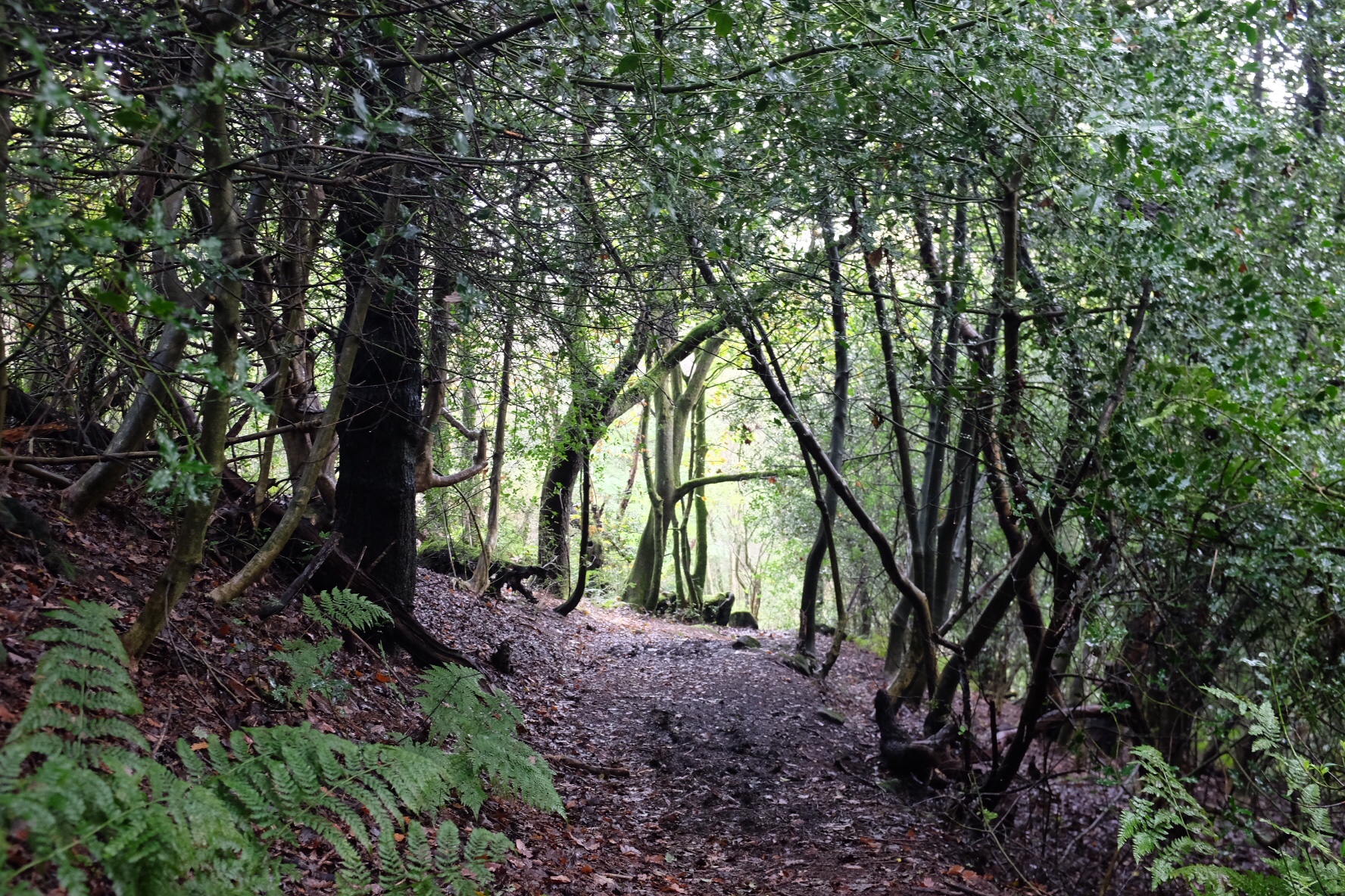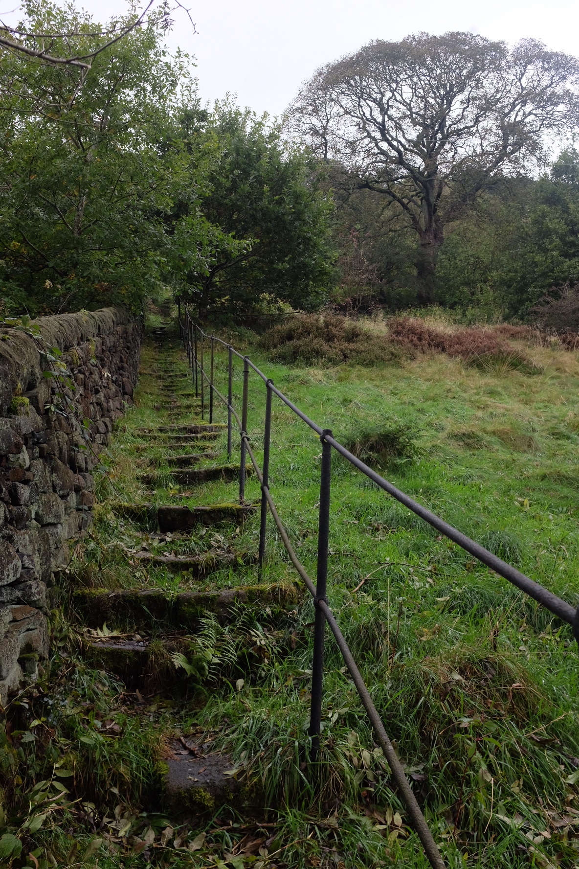 The landscape is tremendous, and we went from being beside the canal to being up on the open hill-tops, via beautiful winding paths through the trees,, in seemingly no time. We were able to sit on a typical stone wall looking out over Hebden, and while the skies were heavy, it barely rained at all, and we had a fair bit of sun. Some of the footpaths, though, were saturated, and even submersed in places, so I had wet feet by the time we got back down to the canal for the final part – meeting with Miranda at the Callis Garden, which she helps manage in what had been waste land beside the canal.