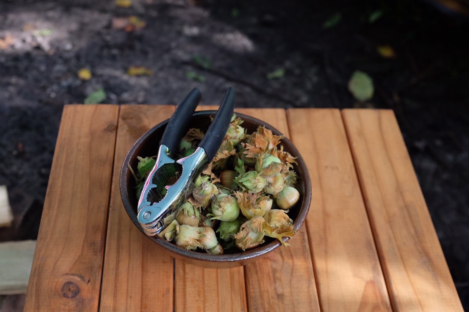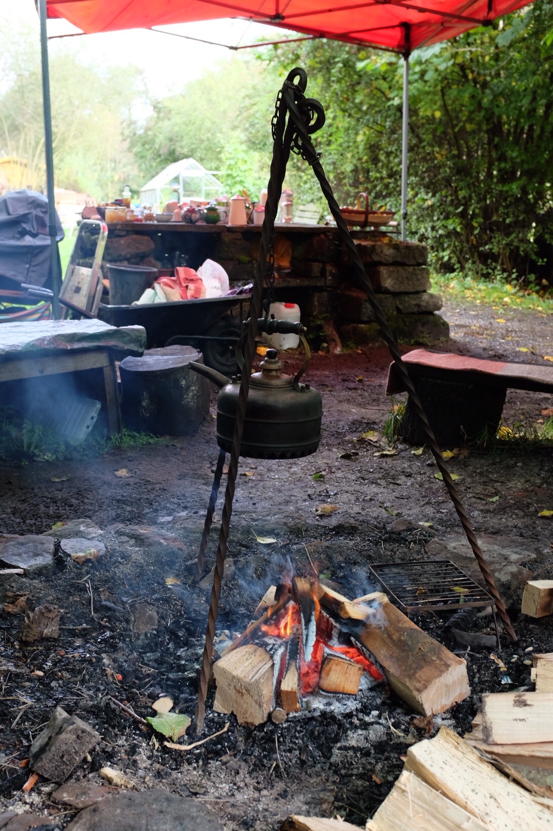 She had lit a fire under a canopy, with logs and benches around, and a kettle hanging on a tripod to boil. She offered various teas from local herbs and flowers, as well as freshly picked russet apples and hazelnuts. I invoked the first line of the meal chant (“We reflect on the effort that brought us this food, and consider how it comes to us”) – apart from the blackberries I picked from the fields in Cornwall, I have not eaten anything so close to where it grew for a long time; Miranda also invoked the people who had planted the trees and hedges whose fruits we were enjoying. I reflected to the group how intimate we were with the elements, in ways that is deeply nourishing – even with cold wet feet; about the traditional zen connection to nature; and about the way man-made structures like the canal and the stone walls had become a part of nature for us.