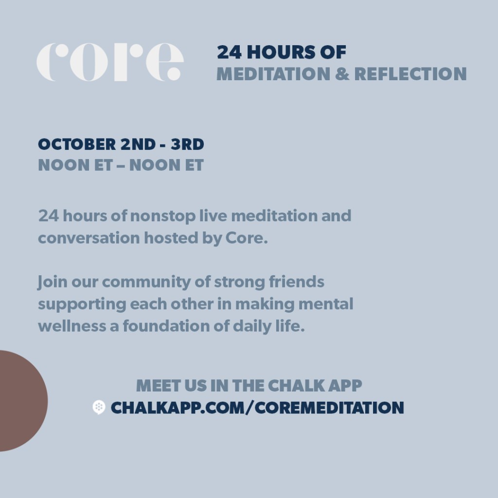 This weekend Core will be hosting a 24-hour event to promote mental well-being, and I will be contributing to that. As long as I stay awake past my usual bedtime, I will be leading a meditation at 9:20 PST on Friday evening.
