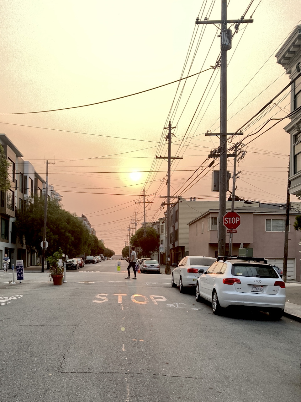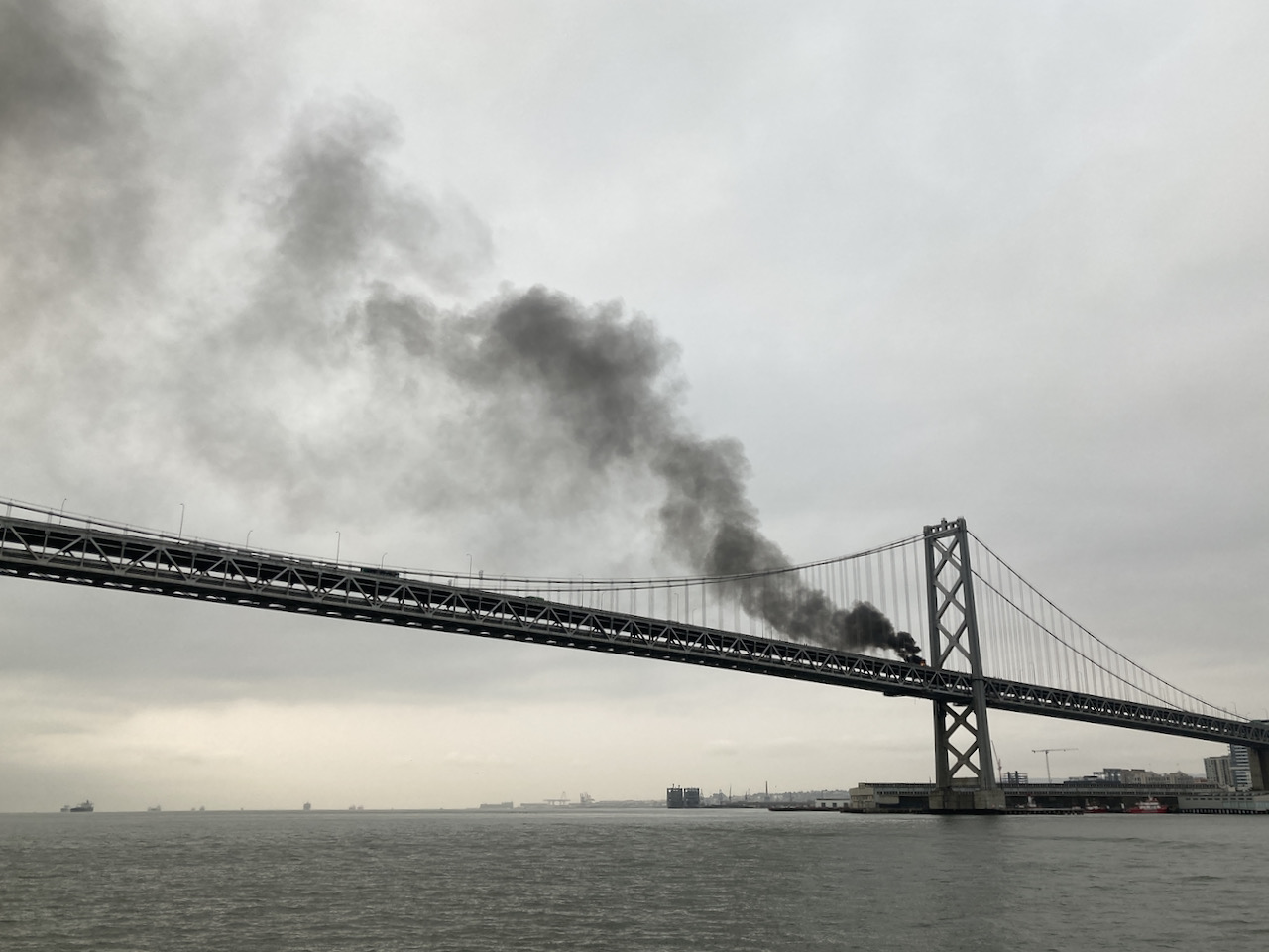 The fog has been quite insistent recently. I have only seen a couple of sunrises from the east-facing kitchen window at my new place, and these were tinged with red – my thought was ‘oh, here we are again.’ And then on Thursday, smoke of a different kind when I arrived for the morning ferry. I was chatting with the regular fellow passenger I see almost every week, and she pointed to a plume rising from the Bay Bridge. It turned out that a roofing truck had caught fire, though we couldn’t tell that exactly from where we were; we could see a few figures standing back, and heard little booms as propane tanks exploded. That was quite a start to the day, though I was feeling great relief that I was not in a vehicle stuck behind the fire on the bridge.