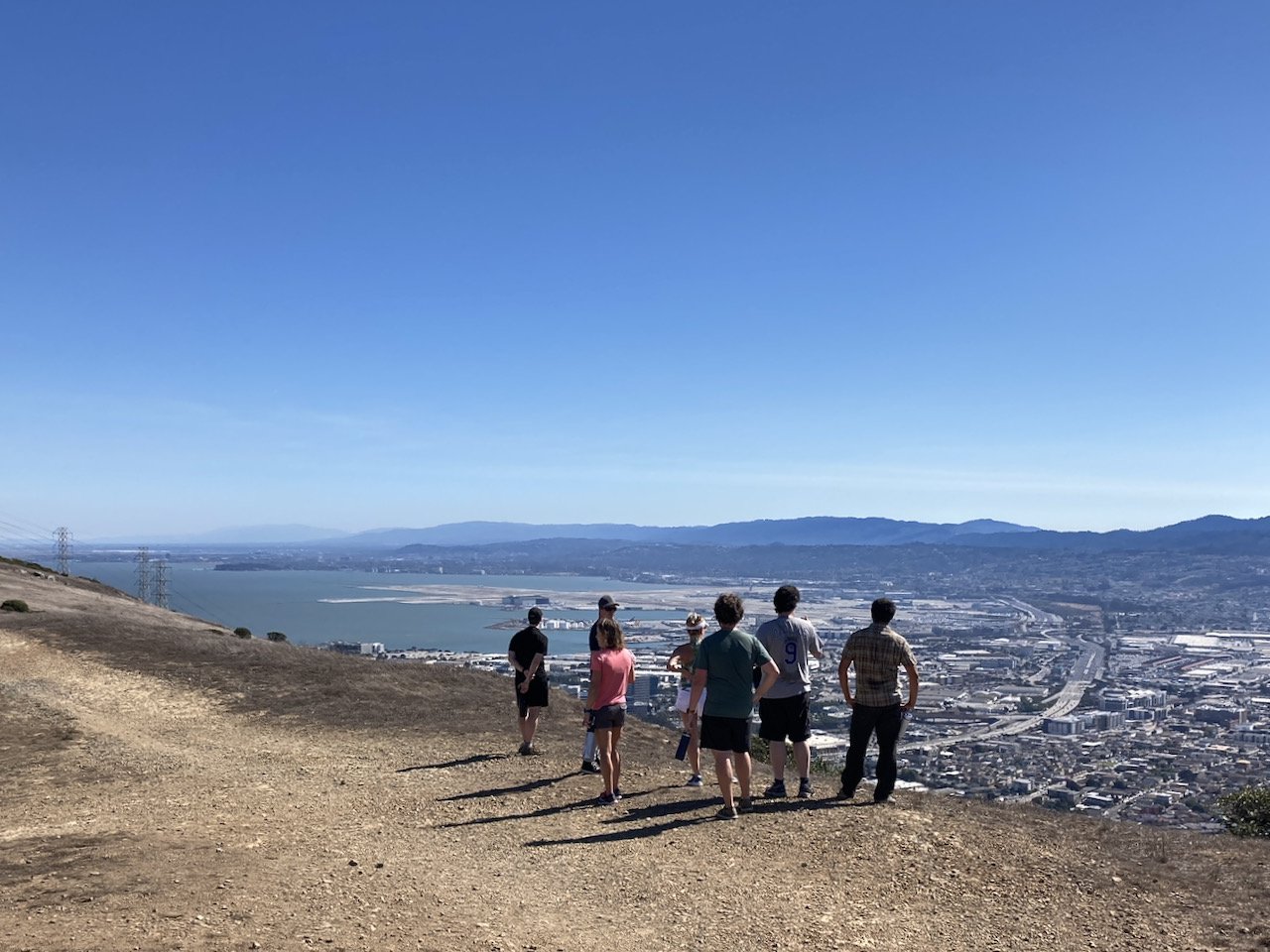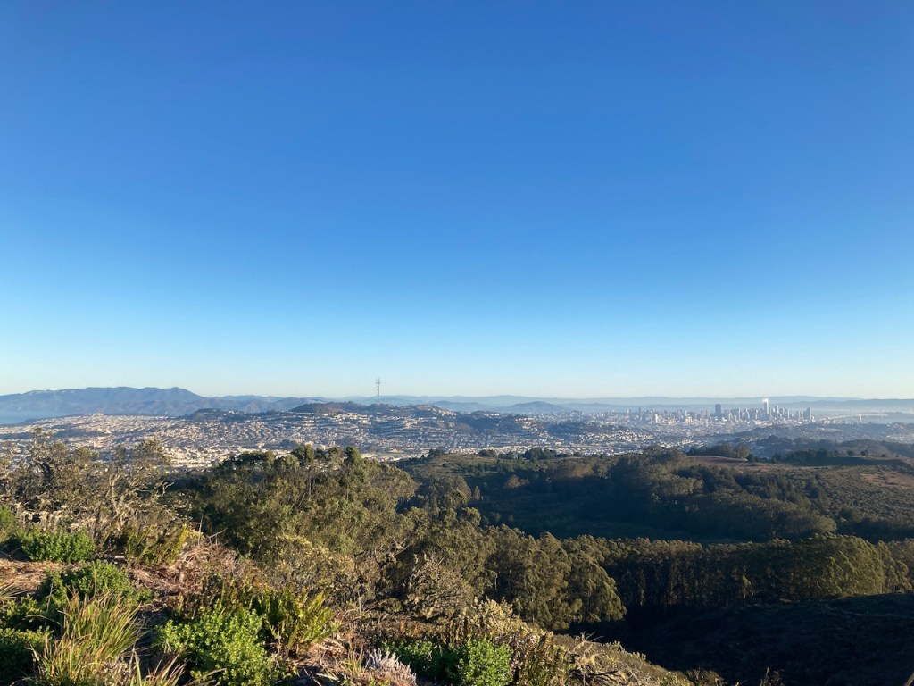 On Wednesday afternoon, having dropped off the rental car and lead a couple of teaching sessions, I returned on my bike to Brisbane, where my student’s company was having an off-site day. The location was high on the hillside already. I wasn’t sure how much the group would be up for in terms of hiking, but the majority were keen to try taking the fire road that run almost straight up to the ridge line of San Bruno Mountain. I had seen that from afar, and had plans for less challenging hikes as well. It was quite a workout, and hot with it, with new-to-me views over the airport (since we were a couple of miles closer than where the road takes you to the summit). The way down required complete attention, also steep and straight down on loose rocks and dirt. It seemed that everyone managed to clear their heads from the day of strategising.