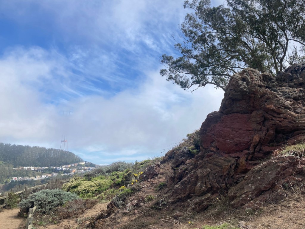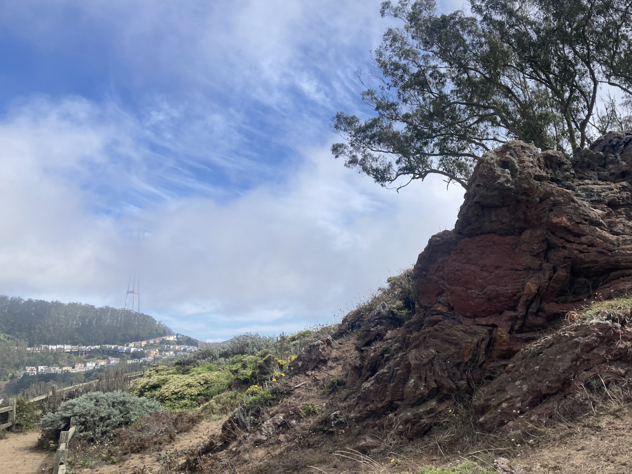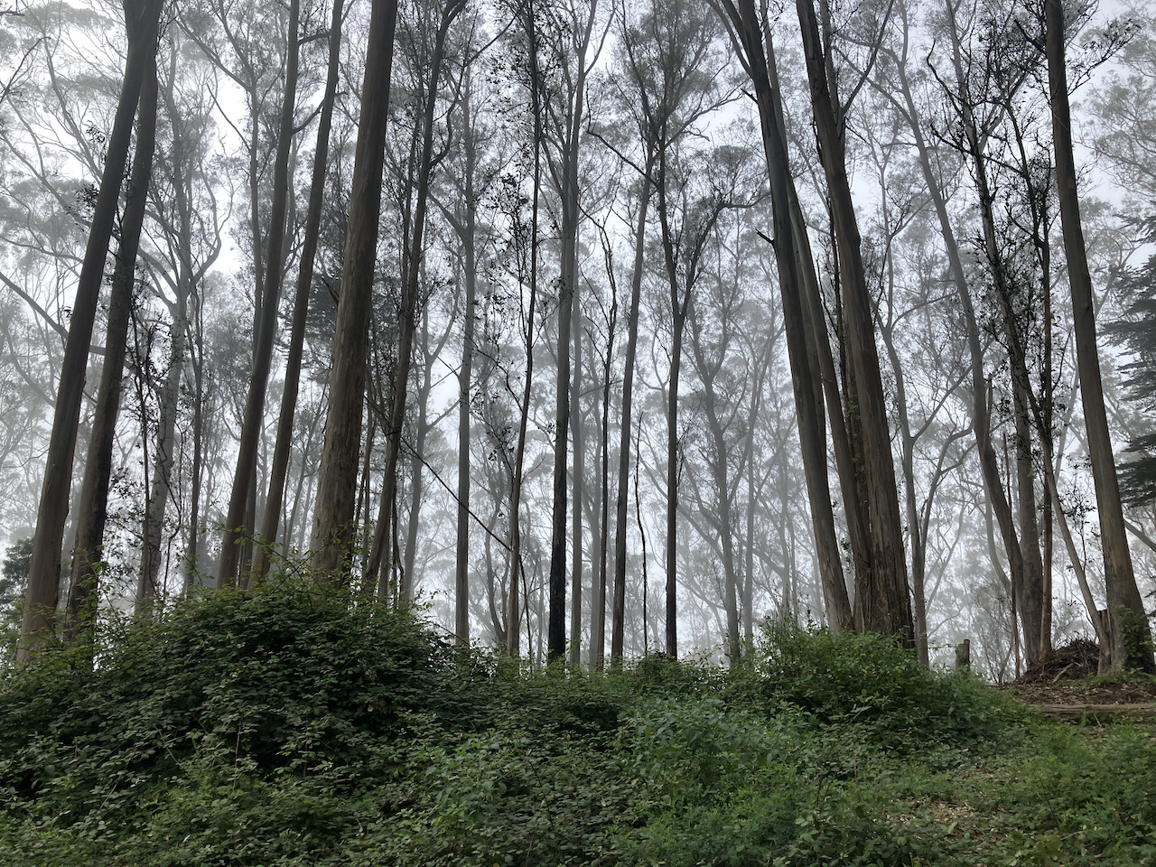I was quite exhausted by all of that, and some unpleasant near-misses with cars while riding this week, but on Friday afternoon I had some time to ride to the foot of Mount Sutro and hike up some of the trails ahead of next weekend’s roam. I haven’t been around there in at least a year, and much work has been done – and a couple of my favourite little trails are currently closed off. The east side was nice and sunny, but the west-facing slopes were catching the fog. I am looking forward to circumambulating the mountain.