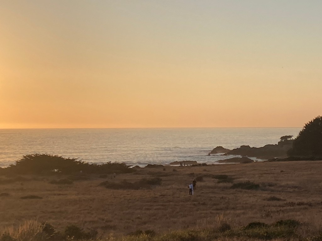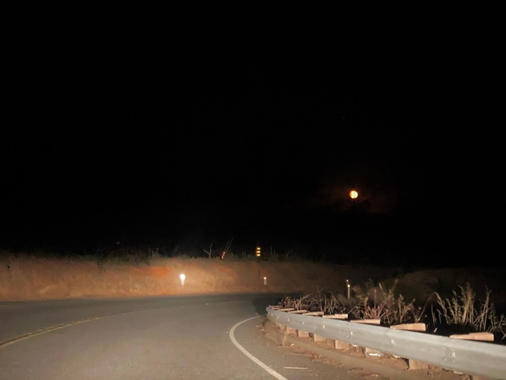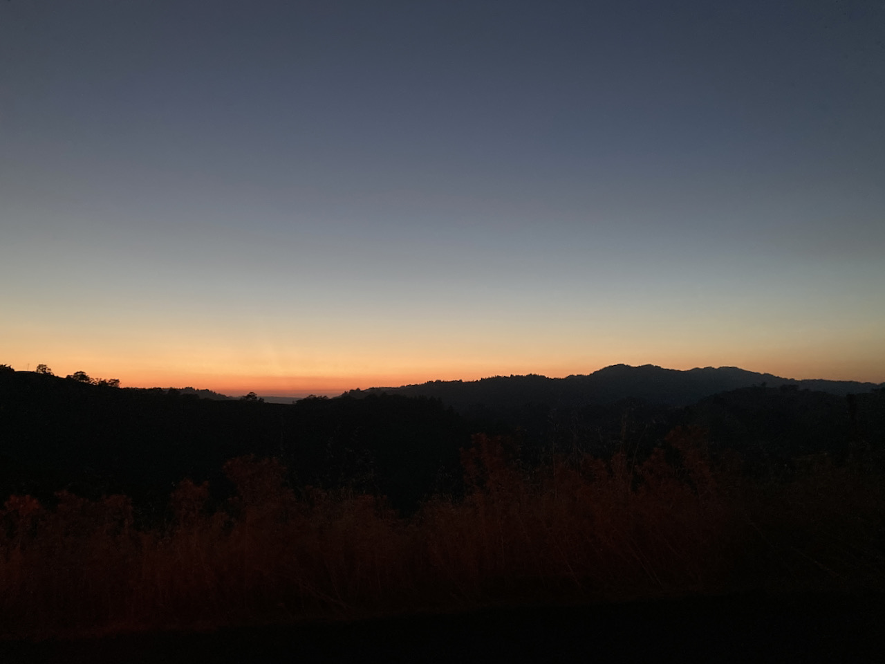 After the ceremony itself, I left just as the sun was setting into the ocean, and opted for the direct route inland to the 101, which was a narrow, crazily winding, and almost entirely deserted road, the light fading all the while. As I crested one ridge, I could see the last rich colours of twilight behind me. At the next, a gorgeous orange moon – one day past full – in front. I was extremely tired from all the driving, but also energised by the beauty.