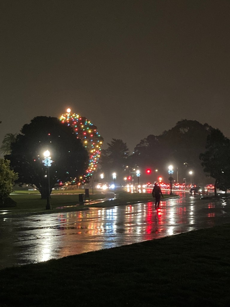 It was only a few weeks ago that I was trundling around in shorts most of the time, and actually looking in my wardrobe and musing why I had so many cold-weather clothes when I so rarely needed them. In the past week, our second atmospheric river of the season has come along, and the temperatures dropped at the same time. I dug out my hat and gloves along with my winter layers for a ride on Saturday morning, before the roam in the afternoon, which was sunny but with a chilly breeze. On Sunday it rained right on cue, and that continued almost non-stop through to Tuesday morning. My only planned outing on Sunday was volunteering with the Bicycle Coalition at the annual party in the afternoon, and I opted to take the streetcar over to the park, and then walk home at the end of the event, as I find walking in the rain preferable to riding. I met many people I knew at the party, and enjoyed getting to mingle, even masked, with bike people again.