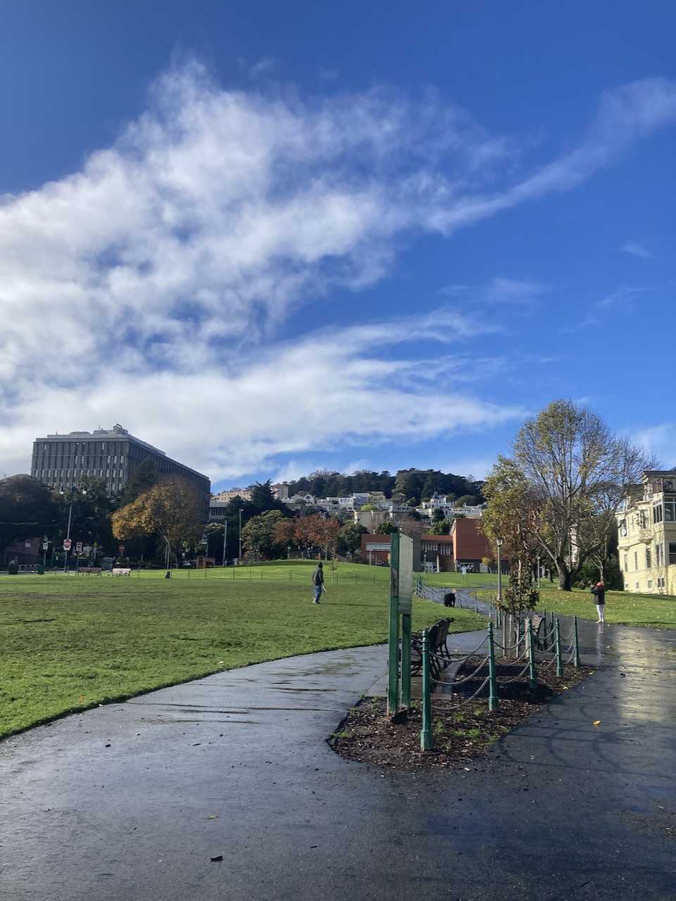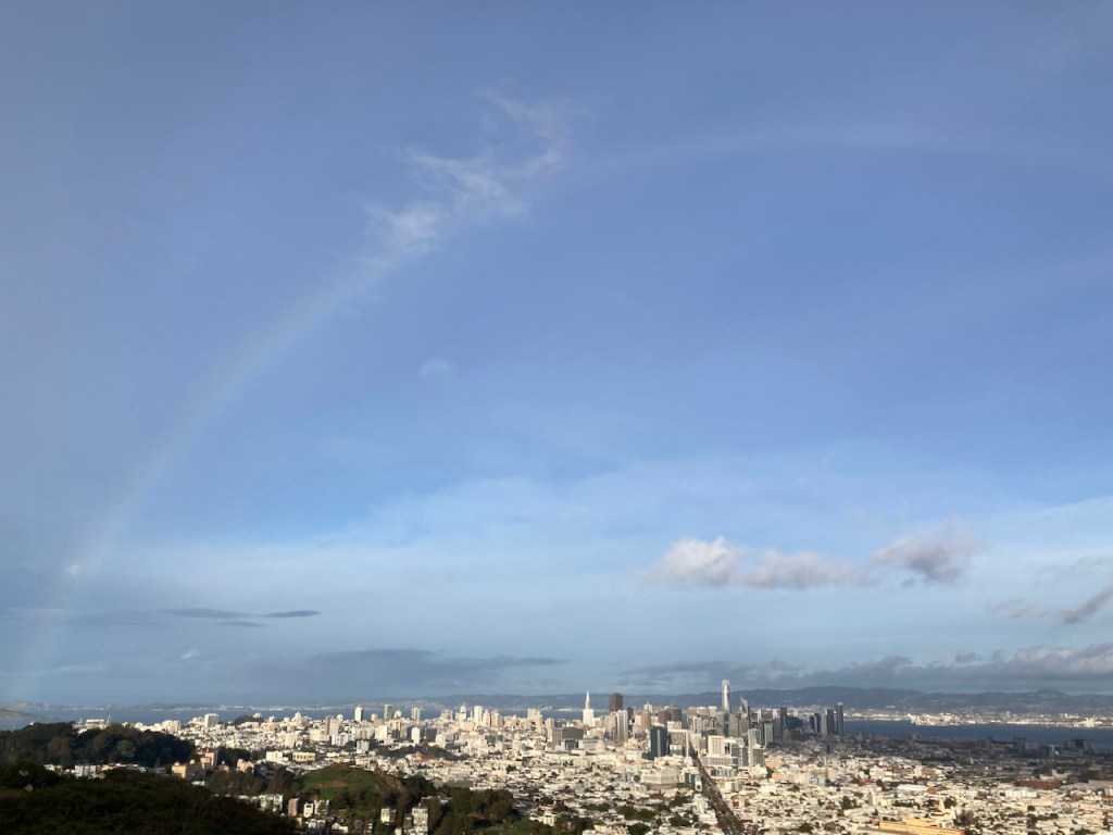 On Monday, with the rain forecast to move on at the end of the morning, I was just leaving the house to sit, with blue skies out of my east-facing windows, when a shower rolled in from the west. I put my bike back and went down on the streetcar, to find mostly clear skies on the Embracadero, though it was pretty chilly, and we had a short sprinkling of drizzle for a few seconds in the middle. We sat through it, and the sun came out again, creating a brief sliver of rainbow over the bay.