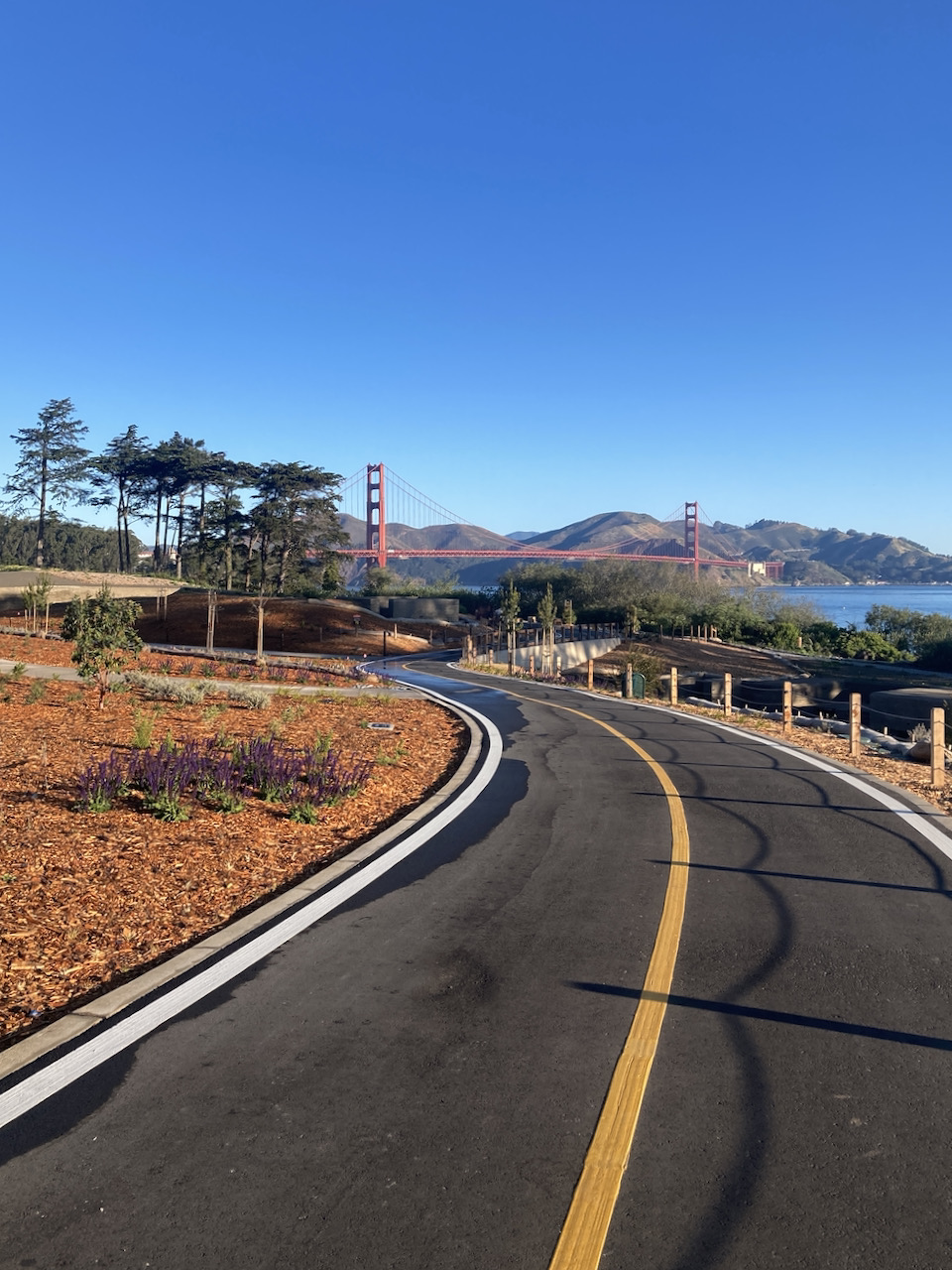 After the weeks away from my bike, I have been taking it gently, but have had some lovely outings already. Apart from taking a trip on Saturday to see the mayor signing the legislation to make JFK permanently car-free, I went out early on Wednesday morning to stretch my legs. I had an idea to go to Fort Point, and then took a little detour to check out the new Battery Bluffs open space in the Presidio, discovering that it included a beautifully smooth bike trail. I will be adding this to my repertoire of low-stress routes, as well as taking a roam through there in the coming weeks.