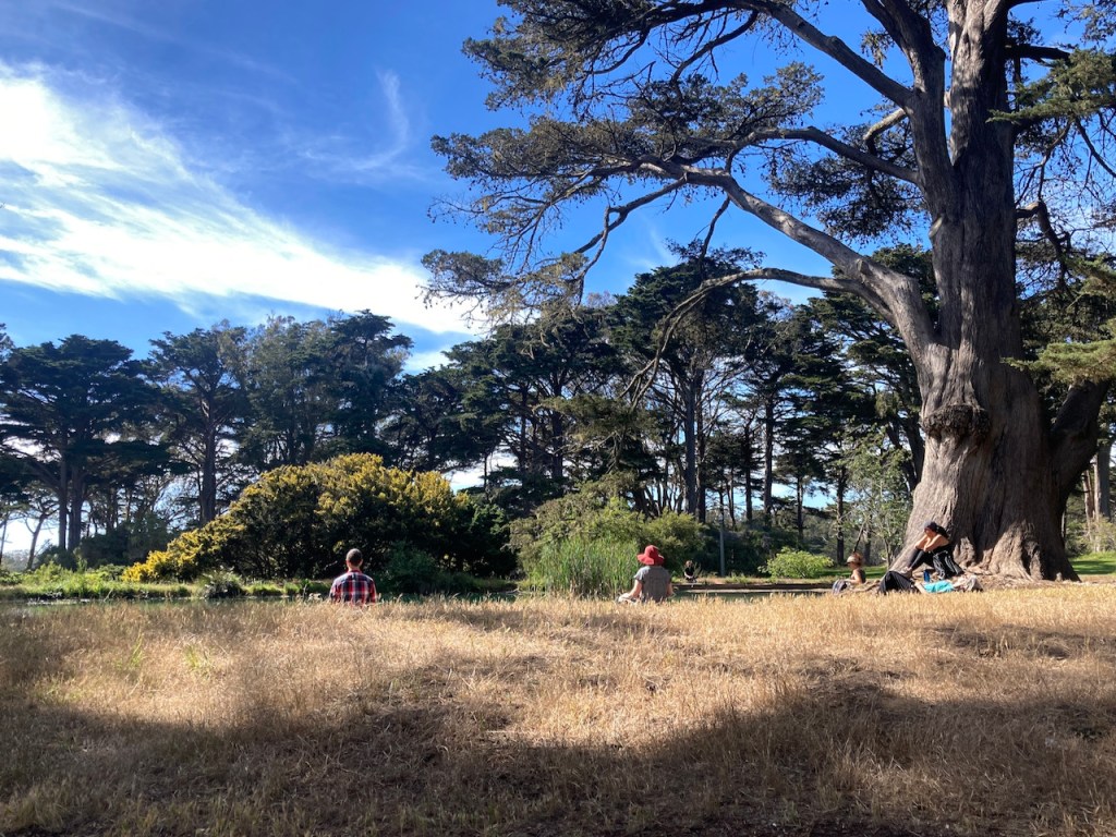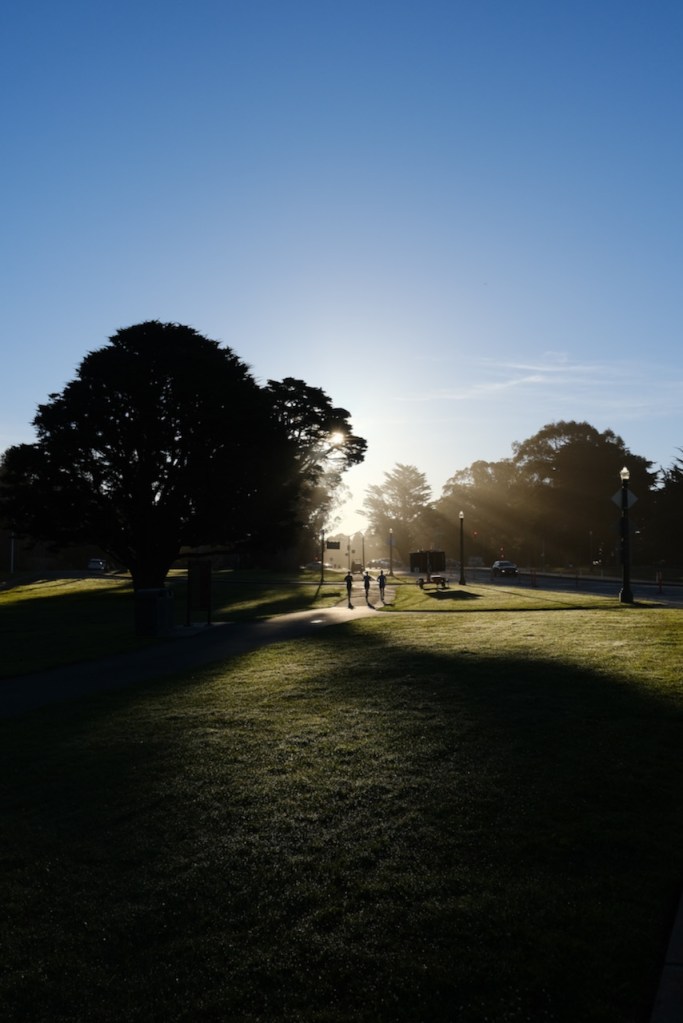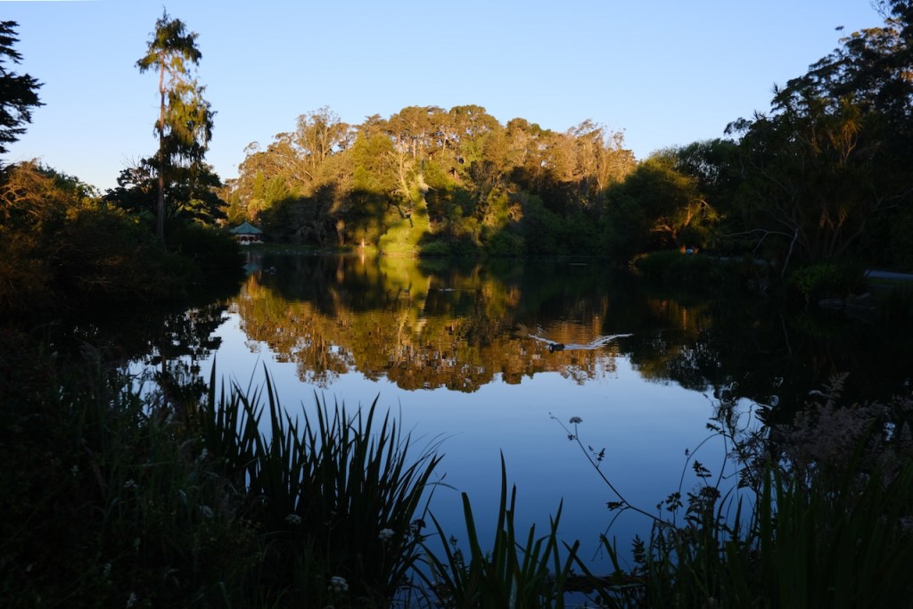 Earlier though, I had followed up on a plan to catch the first sun at Stow Lake – having ridden around it a little while ago but only been able to take pictures on my phone, this time I returned with my new camera, and the difference in quality was reassuring. It was already warm as I rode around almost entirely empty spaces in the park, saw another coyote, captured many roses in the soft light, and made my way home catching the low sun bursting through the trees.