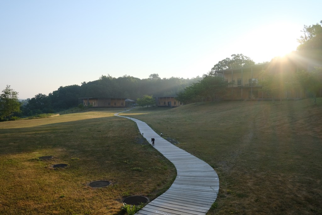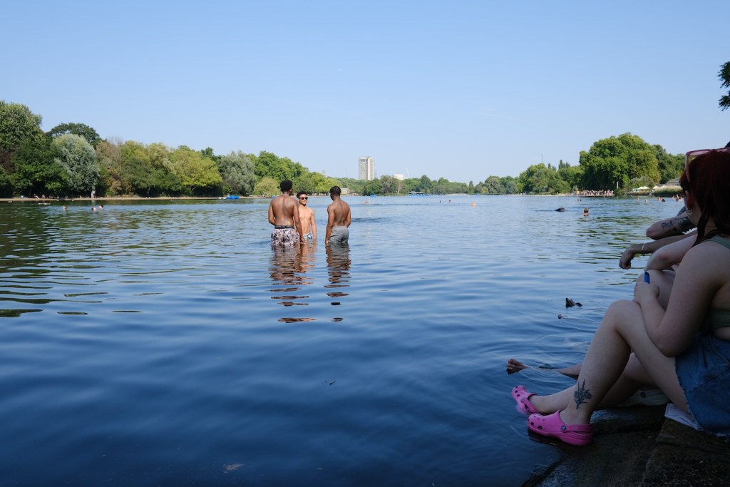 I went for a short walk in the morning, then went into town and met a friend in the park. I opted for shade whenever possible, but with my experiences at Tassajara and Wilbur, I didn’t feel like I was in unknown territory dealing with it – though I wish I could have filled my water bottle at least once more during the afternoon. The last time it was 100 degrees in San Francisco I was moving house, so this didn’t feel especially arduous. We dipped our toes into the Serpentine, which was quite a scene, and then I headed out via slow and heavily packed tubes to meet my hosts at a riverside pub.
