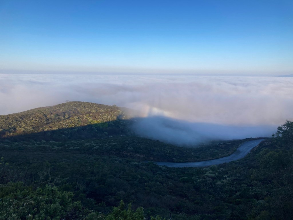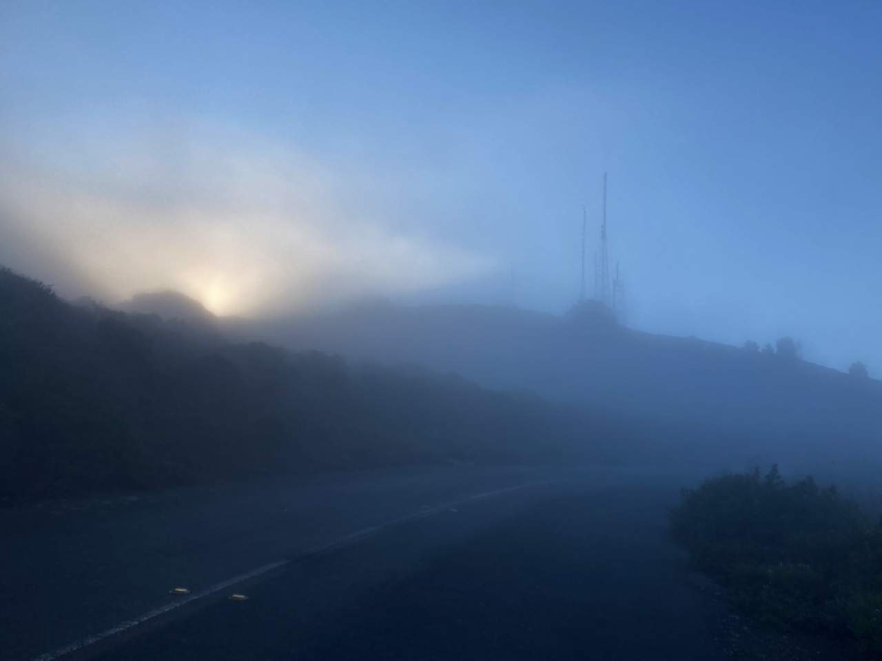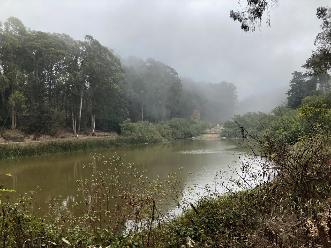 Sunday’s roam was classic San Francisco weather: I left my place in warm sun, and three stops of the streetcar to the west, I came out in a thick undulating mass of fog, which accompanied us all the way around St Francis Wood and Pine Lake. I had had the reverse journey on my morning bike ride – through thick fog that became ever denser as I approached San Bruno Mountain, even from the more reliably sunny east side. I did not expect, half way up the summit road, to emerge above that into a cloudless sky with early sun warming the slopes. The transition moments were breathtakingly beautiful.