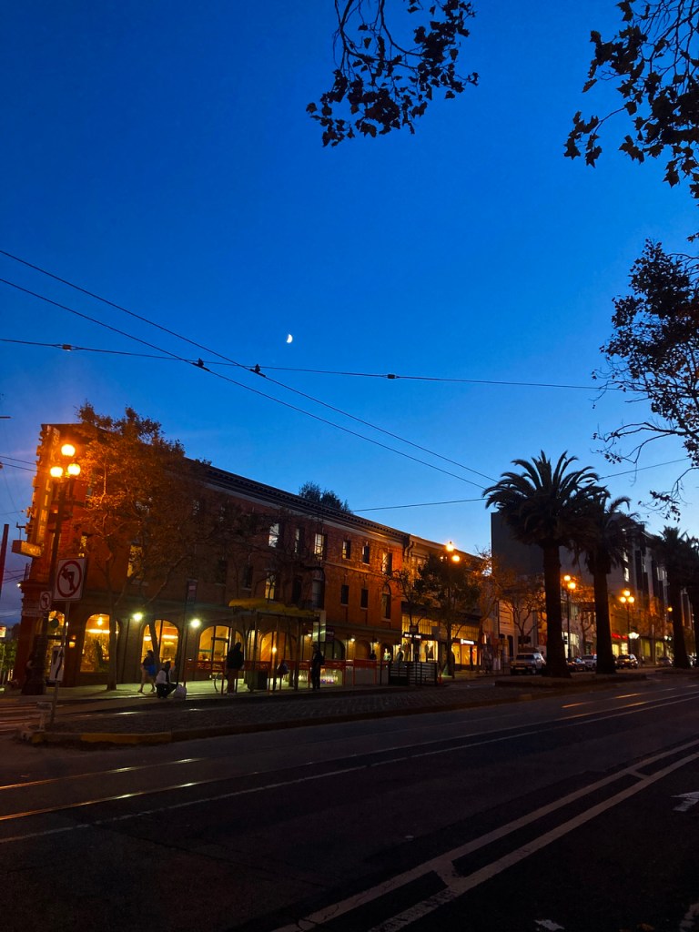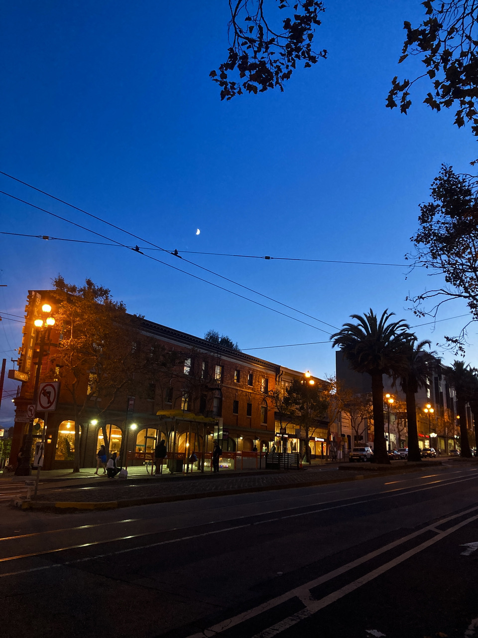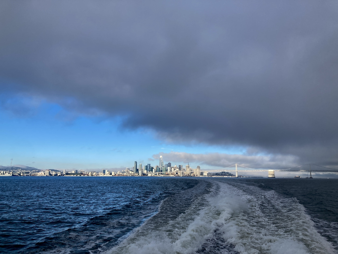 Sunday’s roam was classic San Francisco weather: I left my place in warm sun, and three stops of the streetcar to the west, I came out in a thick undulating mass of fog, which accompanied us all the way around St Francis Wood and Pine Lake. I had had the reverse journey on my morning bike ride – through thick fog that became ever denser as I approached San Bruno Mountain, even from the more reliably sunny east side. I did not expect, half way up the summit road, to emerge above that into a cloudless sky with early sun warming the slopes. The transition moments were breathtakingly beautiful.