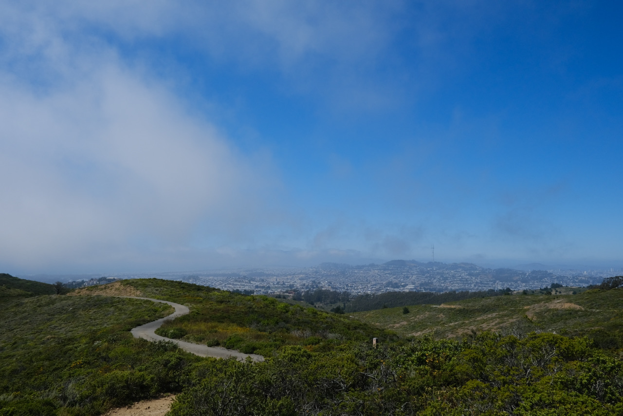 While the corporate meditation world has continued to feel slow (I have lost about a quarter of my income since the beginning of the year, and while that is okay, I hope I don’t lose any more), I have had more time and energy for roaming, and planning roams. The extreme heat that has been impacting the rest of the US – and other parts of the world – has not really made itself felt in San Francisco, although it has probably been sunnier on balance that we might expect in July; warm sun has been balanced by periods of fog, and tempered by cool winds. We have had sunny outings in different parts of the city, and I even scouted out a loop of San Bruno Mountain the other day. It is strange to have ridden my bike somewhere so often, but never to have hiked it, and I enjoyed seeing familiar spots from different angles. There was a section of the descent that I looked at that felt way too steep and precarious to bring other people on (though other people, even a couple of little kids, were going up that path). Look for that on the schedule for the end of the month.