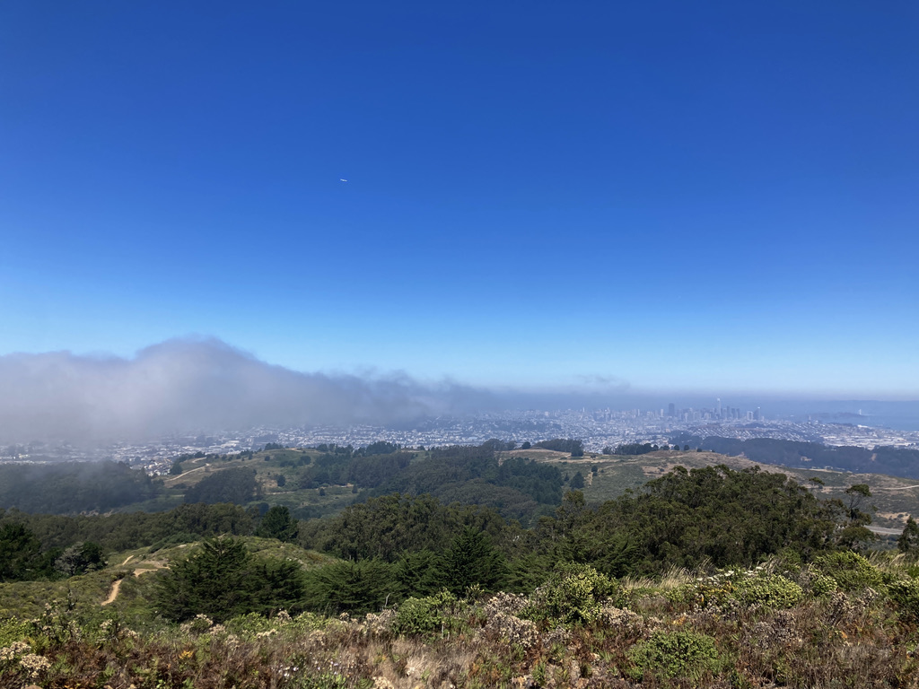 On Sunday, a first roam outside the city – even if we just skirted part of Daly City as we climbed San Bruno Mountain. A late morning start time meant that the fog was doing its typical thing of hanging on the western slopes, while the bay was sunny, but when we paused at the saddle, the skies started clearing. It never completely cleared up, so we didn’t really get views to the south west or over the ocean, but we had plenty of views of the city at least. I think we wore everyone out – with a half-hour ride to and fro, I was definitely feeling it when I got home.