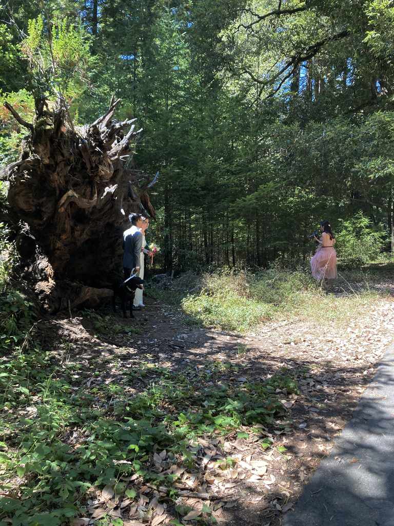 On Saturday I borrowed a friend’s car and drove down the Peninsula to perform a wedding in the redwoods. I hadn’t been to this particular spot before, but it was close to roads I cycled years ago (and revisited for another wedding eighteen months ago). I would rather have been among the riders sweating slowly up the hill rather than navigating its narrow twists in a car.