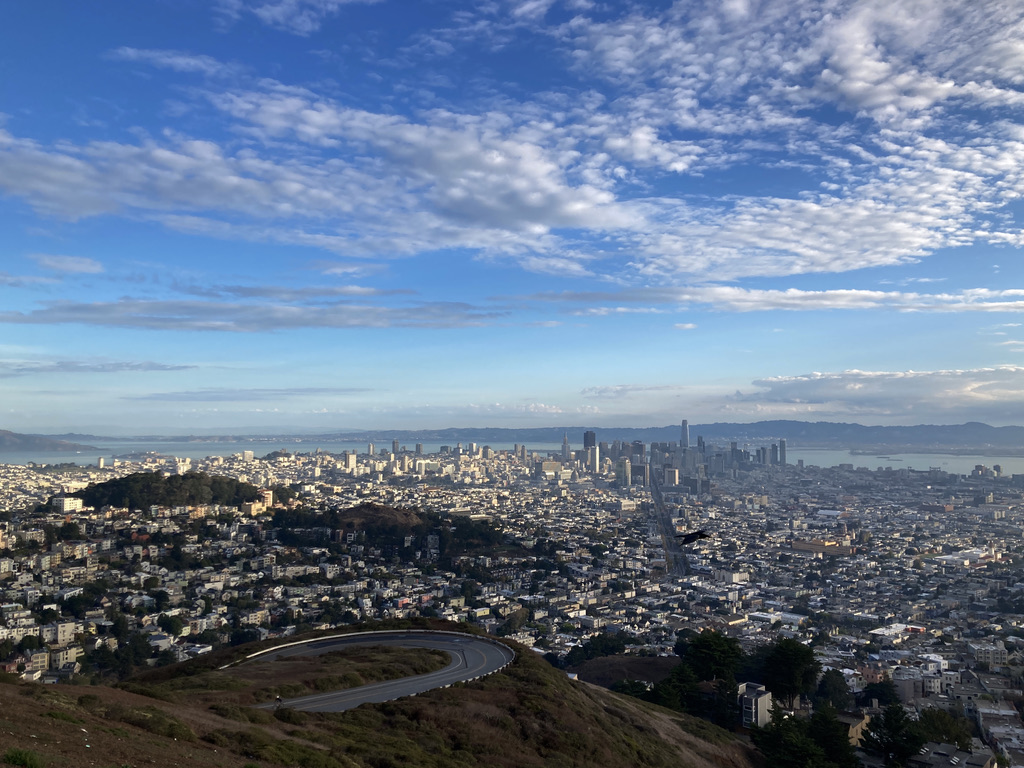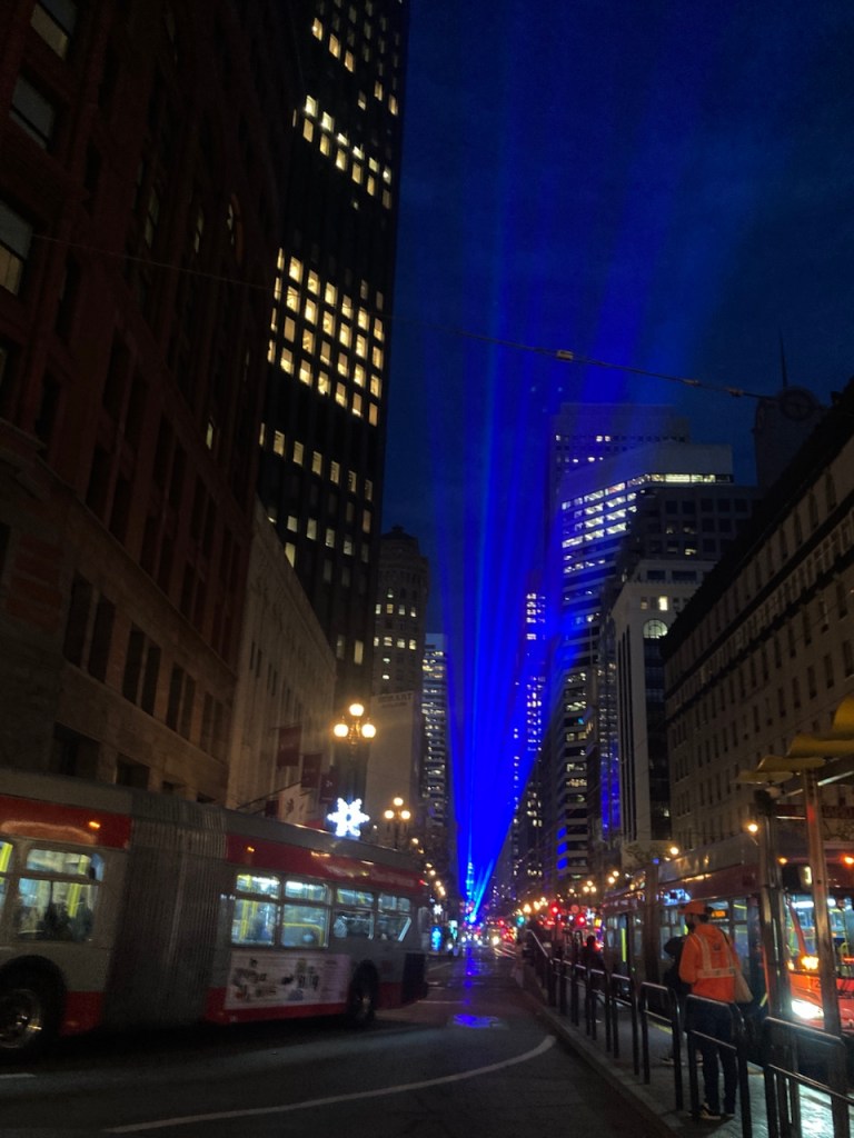 Last week was APEC week in San Francisco; the delegates brought the rain with them, though it held off more than it was forecast to. I had a crazy ride back from the ferry on Tuesday evening: after watching a gorgeous sunset from the deck, there were crowds in the middle of Market Street for several blocks, taking pictures of the giant laser projection. Then crowds of Falun Gong demonstrators in yellow on a number of street corners. Then a long line of buses and streetcars. It turned out the demonstration for Palestine at the Powell Street cable car turnaround had spilled out onto the street, so the police were directing the many cyclists into the oncoming lanes, around all the buses that couldn’t move for the crowds…