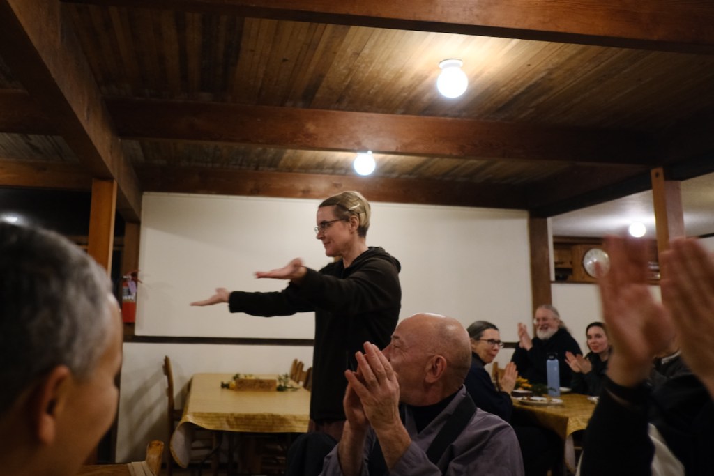 On the dharma seat she was most self-assured, invoking love, warm-heartedness and doing things for the sake of all beings, as well as gently throwing the questions back on the person asking them a few times. It felt like the longest of the three ceremonies, and I knew Zachary had a talk he needed to get to, so he left me to come back with Tova and a few others. This meant I got to stay for dinner, which I don’t always get the chance to do at Green Gulch, though I was also wanting not to linger too long, as I had to get myself back to the East Bay afterwards with more stuff. I was glad to stay and chat, though, and glad that a truck which had blocked a section of Highway 1 as we headed back did not detain us too long as we could take to the back roads.