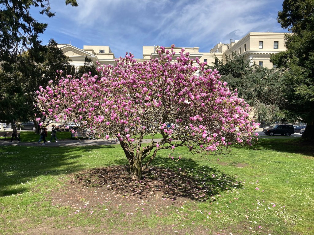This winter has seemed long in the continuing rain and cool temperatures. Last weekend’s rain forced postponments of both roams that I had scheduled, so we ended up with three on consecutive days this past weekend: it was warmest on Friday, but Saturday and Sunday were nicer than forecast as well. Flowers were abundant all over the city, and the birds have got into the spirit of the season as well.