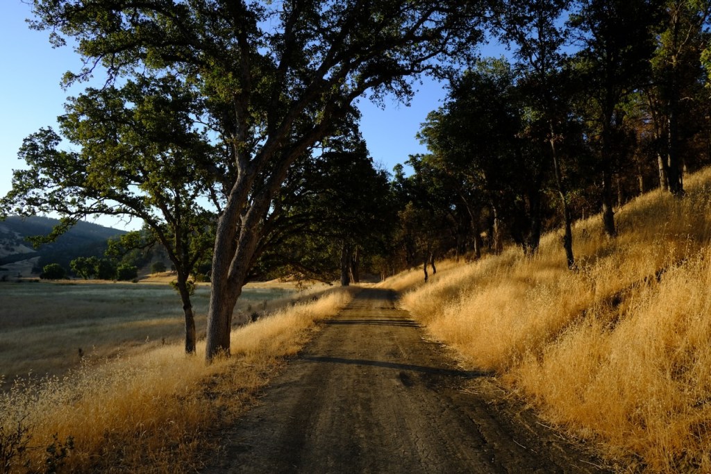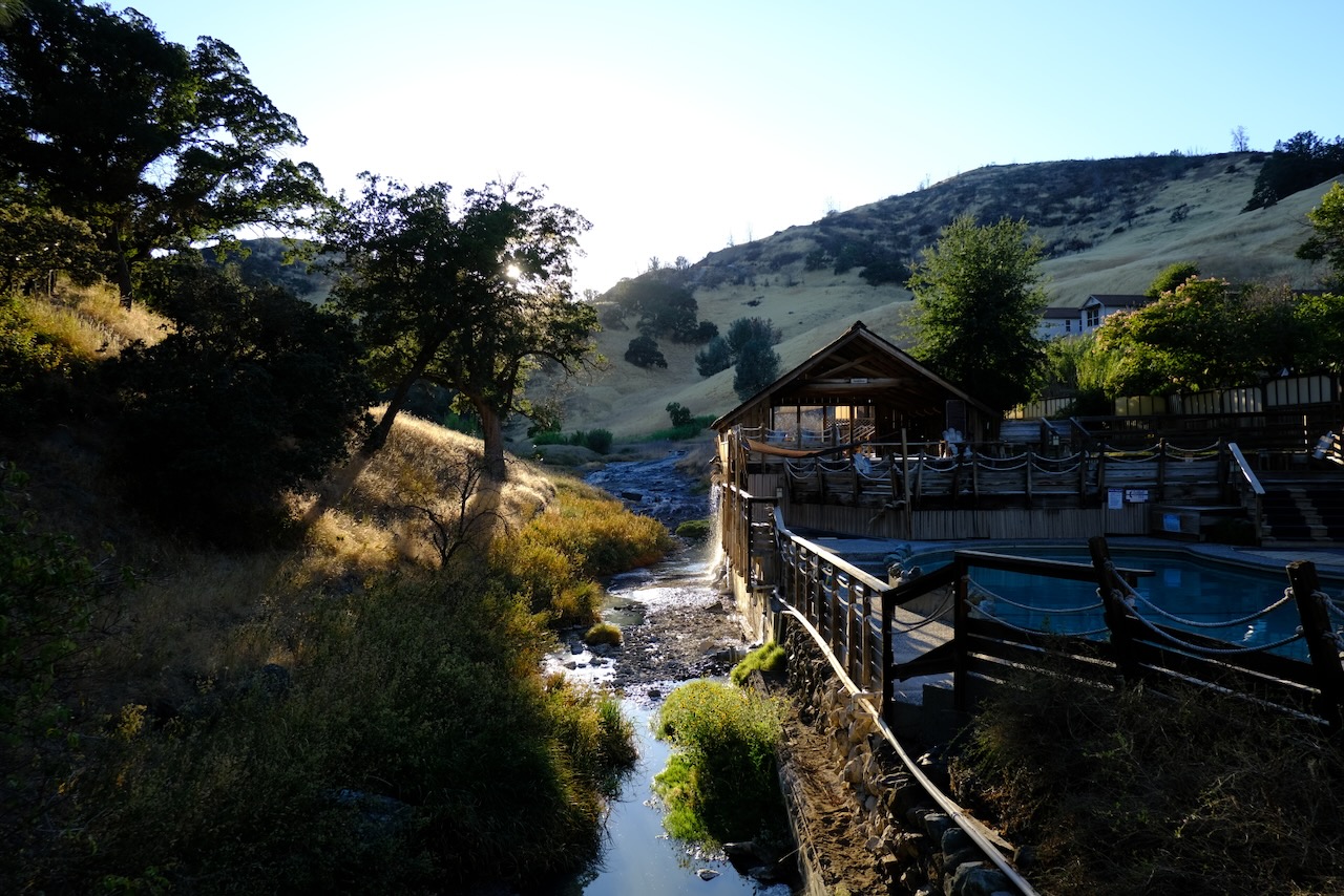 Typically, I found it hard to stay awake in the evening. I ate dinner early, enjoyed the baths after the sun had dipped behind the hill, while it was still very warm, and slept even earlier than I do in the city. This allowed me, since we were further from the solstice than on my previous visit, to wake up early enough to see the stars and the Milky Way. Before the sun came up I rode one of the clunky house bikes up the valley, seeing turkey, quail, deer and rabbits. On the way back, the first light on the oaks and the golden grasses was magical. At the bath-house, I saw a young rattlesnake lined out on the concrete warming itself up; I got one of the staff to pick it up and take it away, as I used to do at Tassajara sometimes.