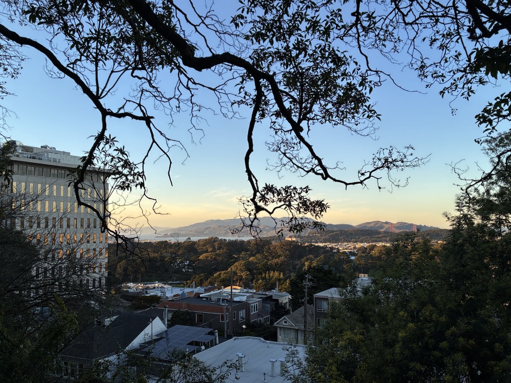 After getting through Saturday’s roam, albeit tired at the end of it (I think someone clocked it at 1900′ of elevation), Friday’s jaunt up Mount Sutro – even taking the steepest trails – felt like a breeze. With all the trees being taken down, which meant many of the trails were closed, there are more views than ever, and we got to sit in the late afternoon sun at the summit, which was nicer than I remember.
